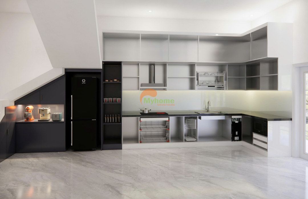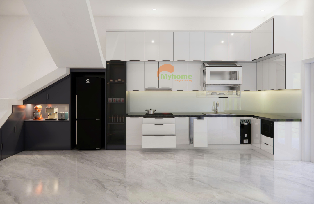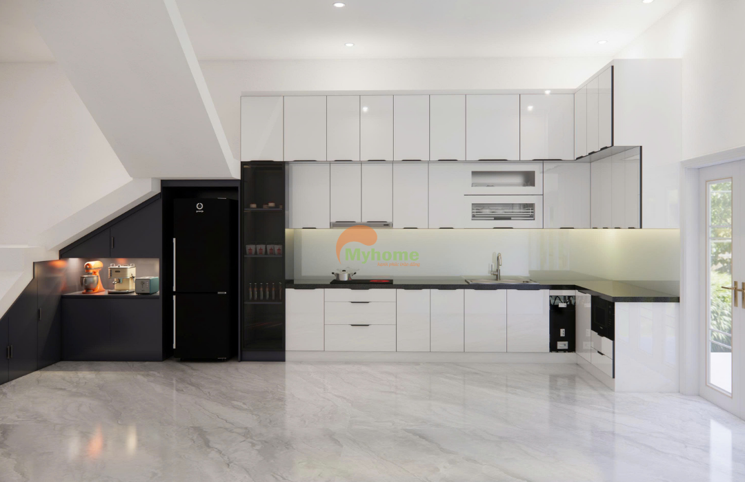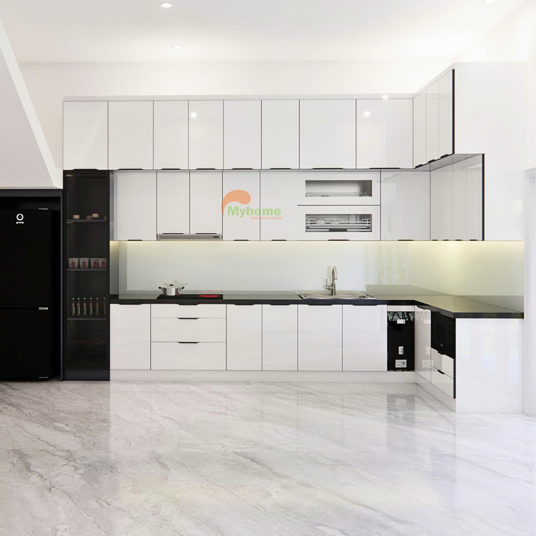 Hệ tủ bếp chữ L kịch trần tối ưu diện tích lưu trữ, bề mặt cánh phẳng bóng mịn dễ vệ sinh